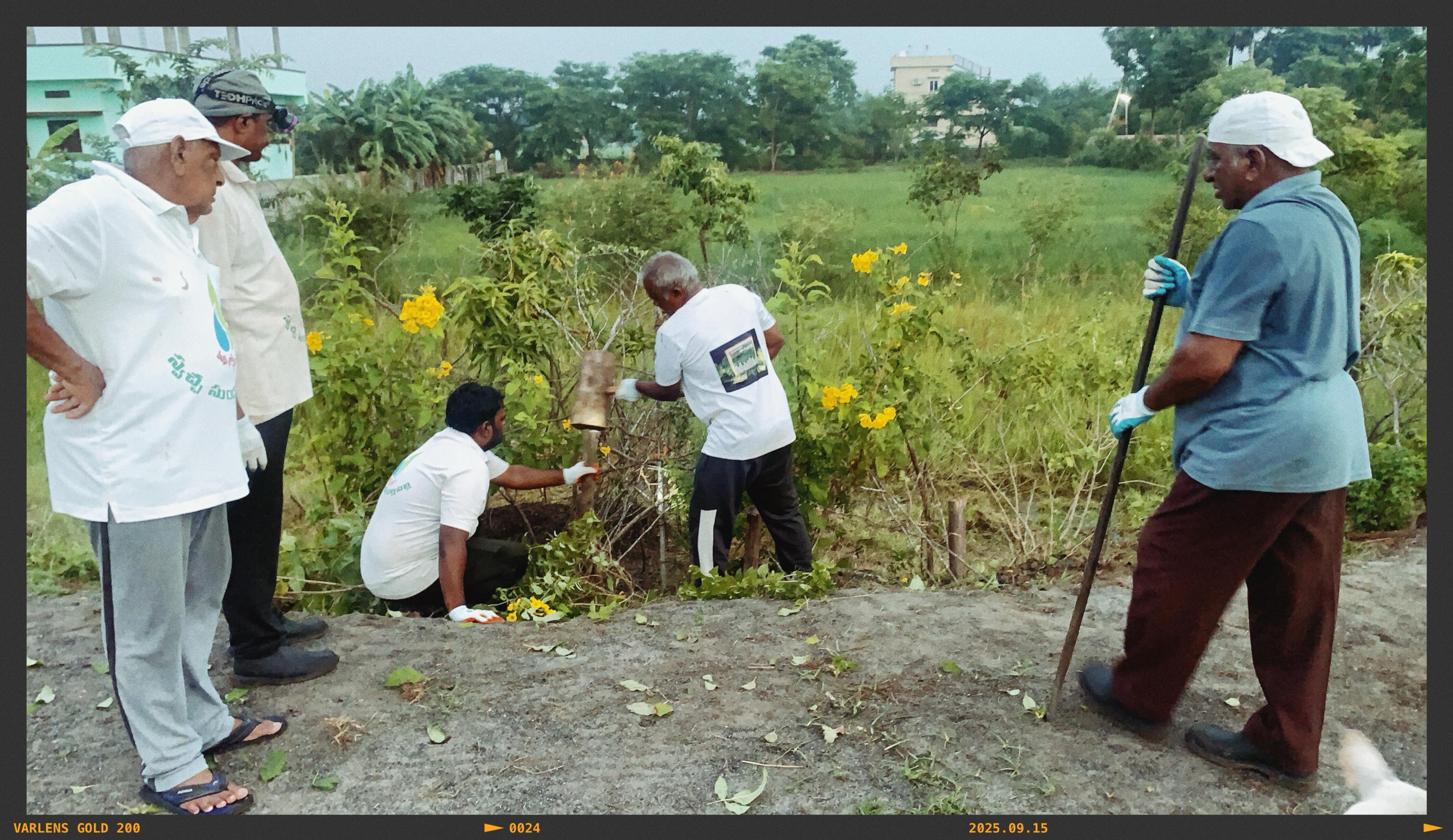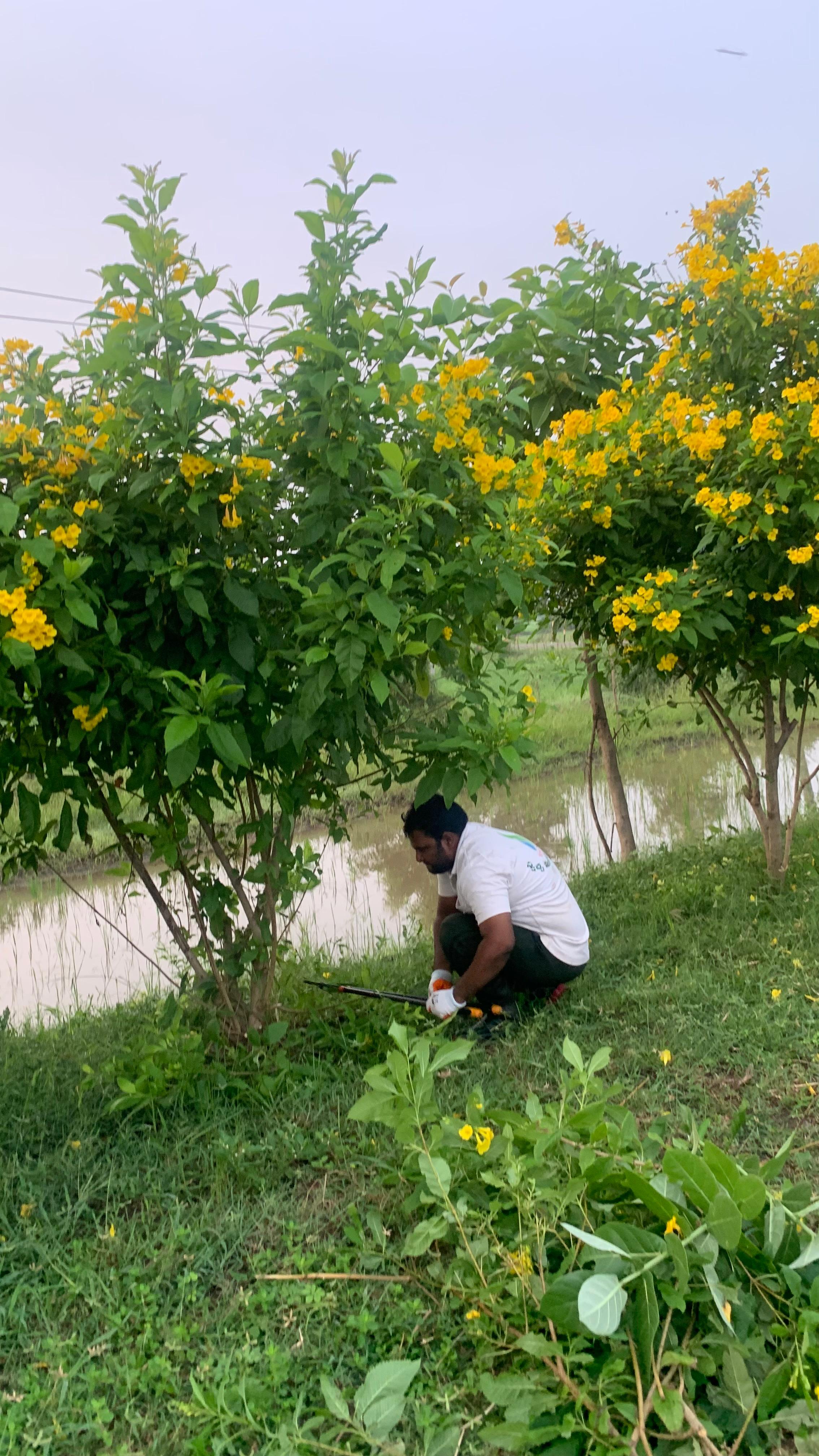 ఐదుగురు కార్యకర్తలు మాత్రం “స్వాగత ద్వారం” వద్ద రోడ్డు మార్జిన్ లో మట్టి కొట్టుకుపోకుండా ఉండడానికి పెగ్గులు పాతి అడ్డుగోడలా కట్టారు. అక్కడ ఉన్న సువర్ణ గన్నేరు మొక్కలను వరుస క్రమంలో సరిజేసి అందంగా తయారుచేశారు.