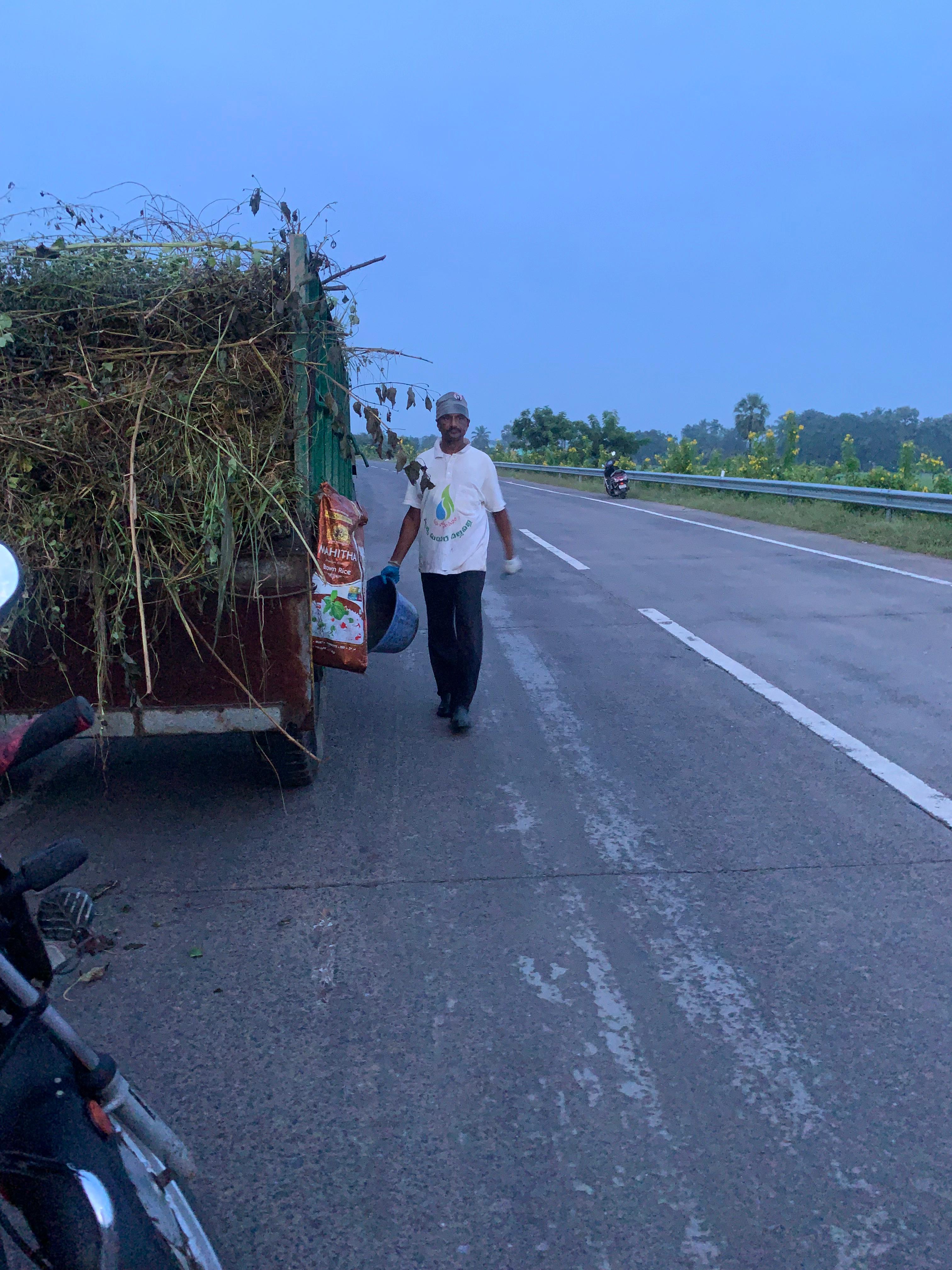 కార్యకర్తలలో ఐదారుగురు నిన్న చేసిన పనికి సంబందించిన చెత్తను ట్రాక్టర్ లో లోడ్ చేస్తున్నారు. లోడింగ్ ఉండడం వలన రోజూ చేస్తున్న మొక్కలకు కర్రపాతి కంప కట్టే పని ఈరోజు ఆపవలసి వచ్చింది.