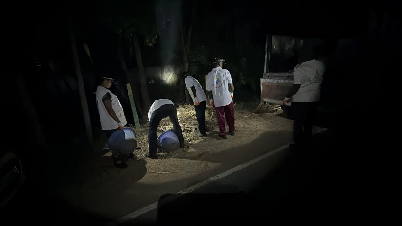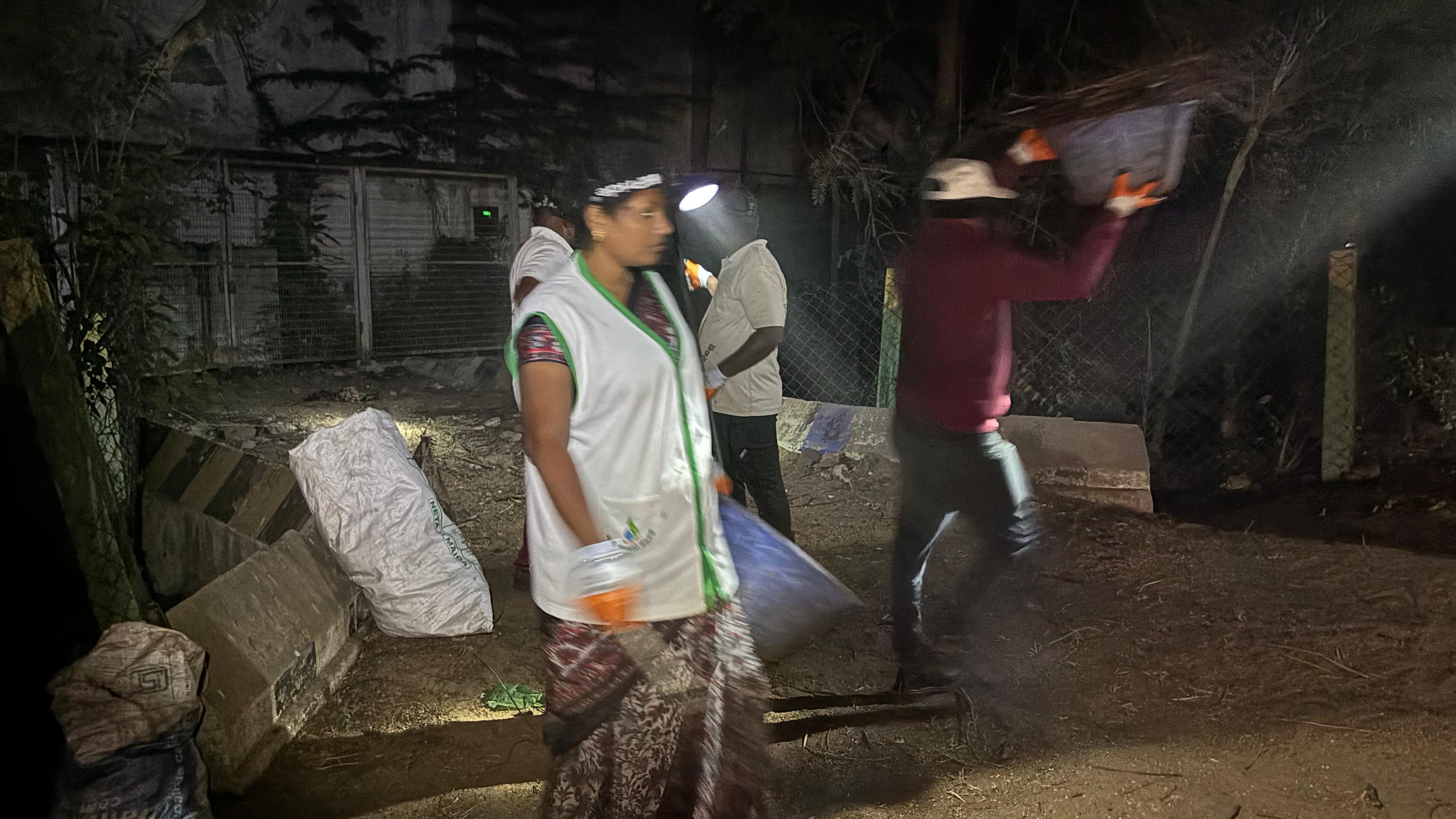 - ఒక్క గంట పనుల తర్వాత, రకరకాల వ్యర్థాలు గుట్టలు గా తేలాక - డిప్పలందుకొని చెత్త లోడింగుకు దిగుతారు- అప్పటికి కాస్త వెలుతురు వచ్చి, హుషారు పెరిగి, వాళ్ళ పనులు వేగవంతమౌతుంటాయి!