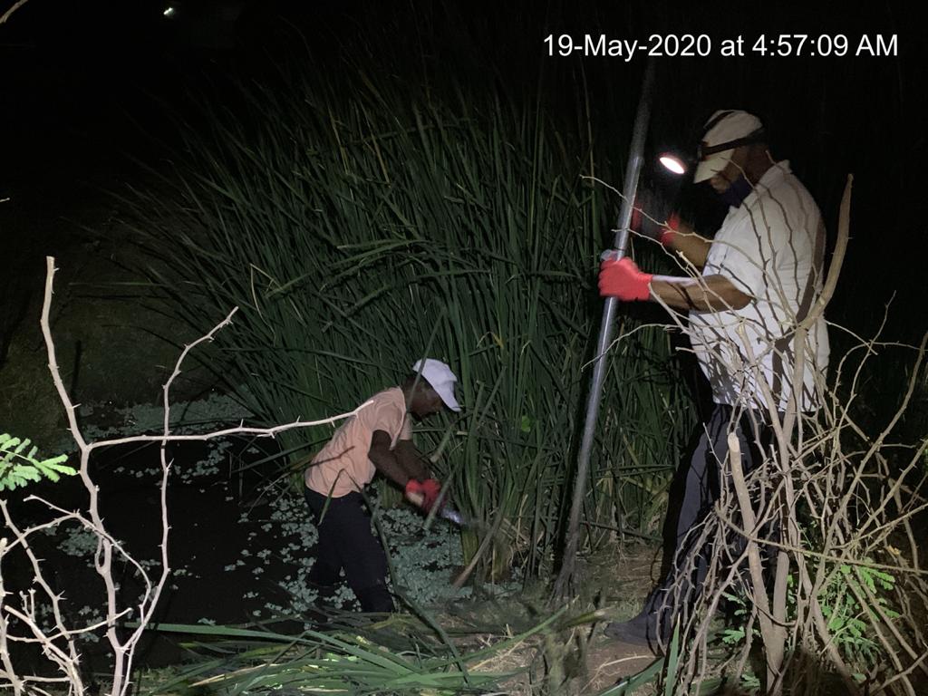 2) గడ్డి వాముల దగ్గర డ్రైనులో ఎలా లోతు పెరిగిందో గాని, రొమ్ము బంటి ఆ గుంటలో దిగి, 3 గజాల ఎత్తుకు పెరిగిన జమ్మును BSNL కు చెందిన ఒక కురచ – బక్క ఉద్యోగి నరికి, పీకి ఒడ్డున వేయడం – దానిని మరొకరు గొర్రులతో లాగి, పోగులు పెట్టడం – ఇదంతా మబ్బేసిన మసక చీకట్లోనే (ఆ దగ్గర్లోనే నిన్నా – ఈ రోజు ఒక పాము నీటిలో విహరిస్తున్నది! ) చకచకా జరిగిపోయింది.! (అసలు ఈ స్వచ్చోద్యమ సైనికుల్లో – ఇలా ఒకొక్కరి సాహసాలను వివరించాలంటే ఒక్కో గ్రంధమైపోవచ్చు.