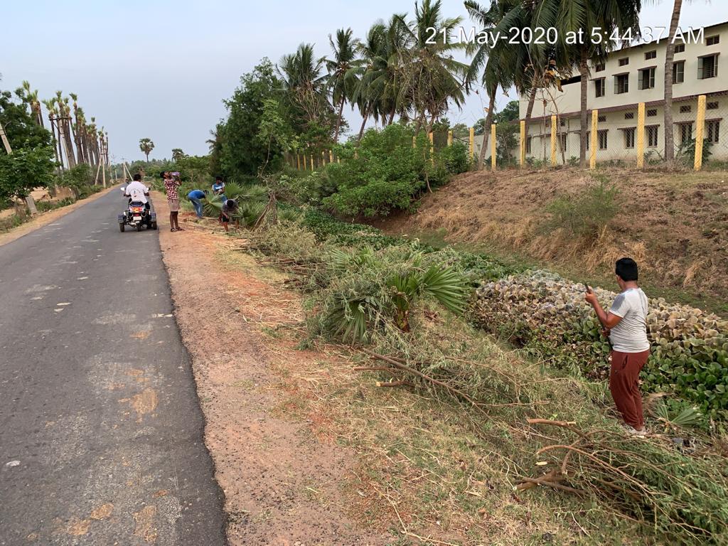- మొక్కలకు రక్షణగా ముళ్ళ కంపను పాతి, తాళ్ళతో బంధించి, కుదుళ్లను సరిచేయడంతో బాటు – పెద్ద చెట్లకు గూడ ముళ్ళ కొమ్మలు చుట్టి, పశువులు రుద్దుకోకుండ జాగ్రత్త వహిస్తున్న నలుగురైదుగురి దీక్ష!