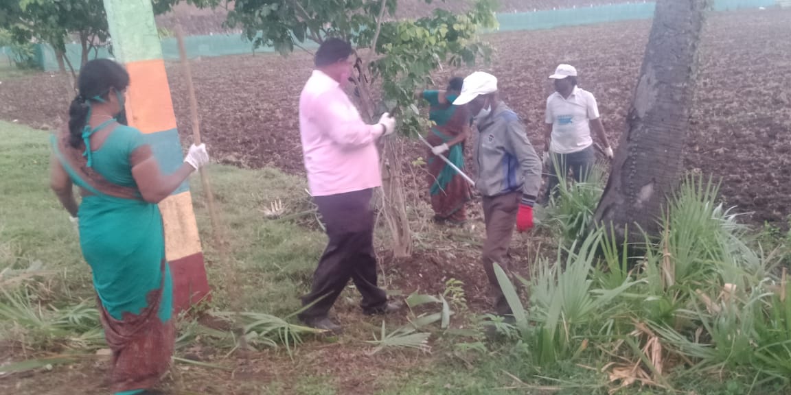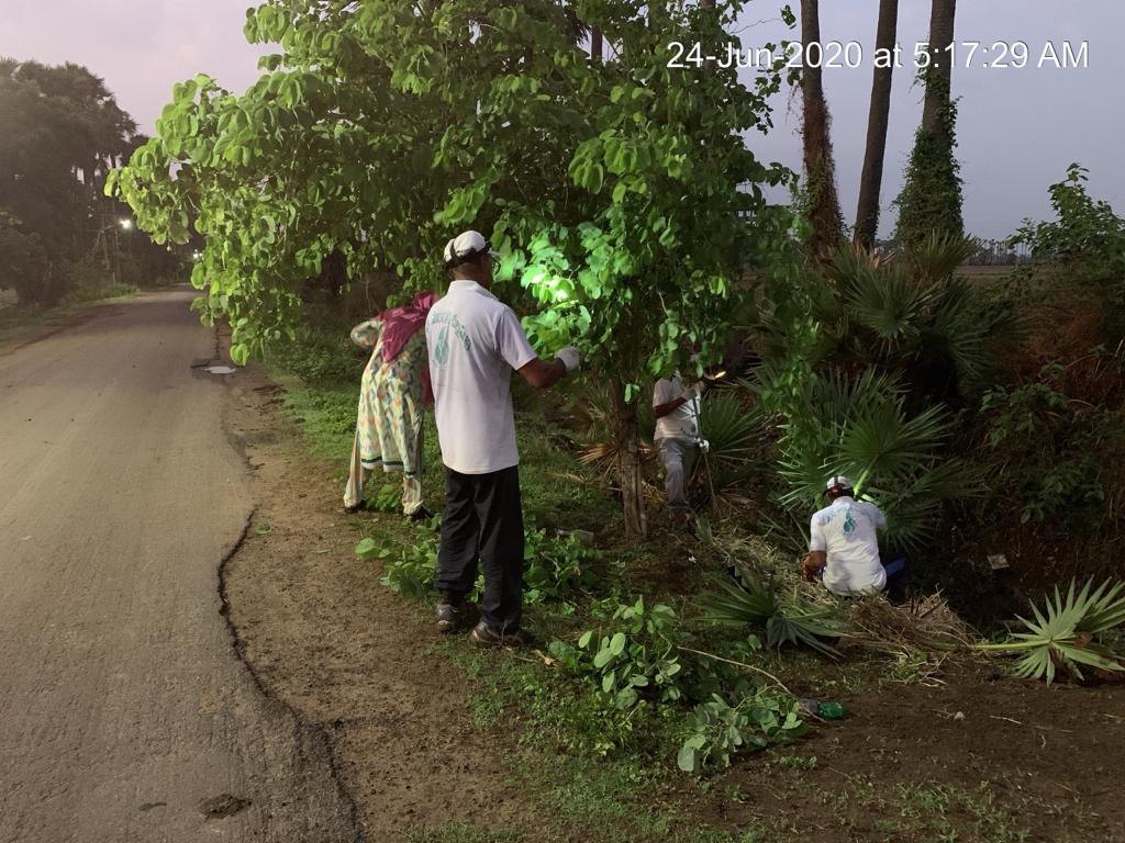 - మరొక బృందం-16 మంది కత్తి వాటం-గొర్రు వాటం-ఇంకా చీపుళ్ల కార్యకర్తలు ఈ శివరామపురం-కోళ్ల ఫారం (కుడివైపు) మధ్య ఉన్న గడ్డి,పిచ్చి, ముళ్ల మొక్కల, ఎండు తాటాకుల, ప్లాస్టిక్ తదితర వ్యర్ధాల పని పట్టారు. రోజూ ఏరుతున్నా ఇన్ని ఖాళీ సీసాలు దొరుకుతున్నాయంటే మనం ఒక పేద-ఉష్ణ దేశంలో ఉన్నామో-వేడిని, మత్తును పుట్టిస్తాయనే వంకతో మద్యపానం చేసే ధనిక-చలి దేశంలో బ్రతుకుతున్నామో తెలియడం లేదు. 280 ఏళ్ల నాడు వేమన్న వ్యంగ్యంగా-