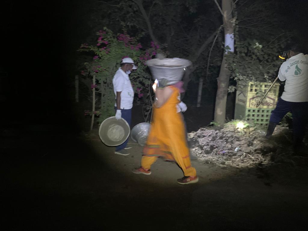 ఇవికాక నలుగురు మహిళా కర్మిష్టులు చీపుళ్లతో వచ్చే పోయే వేగవంతమైన వాహనాల రద్దీని కాచుకొంటూ రహదారిని శుభ్రపరుస్తూనే ఉన్నారు.