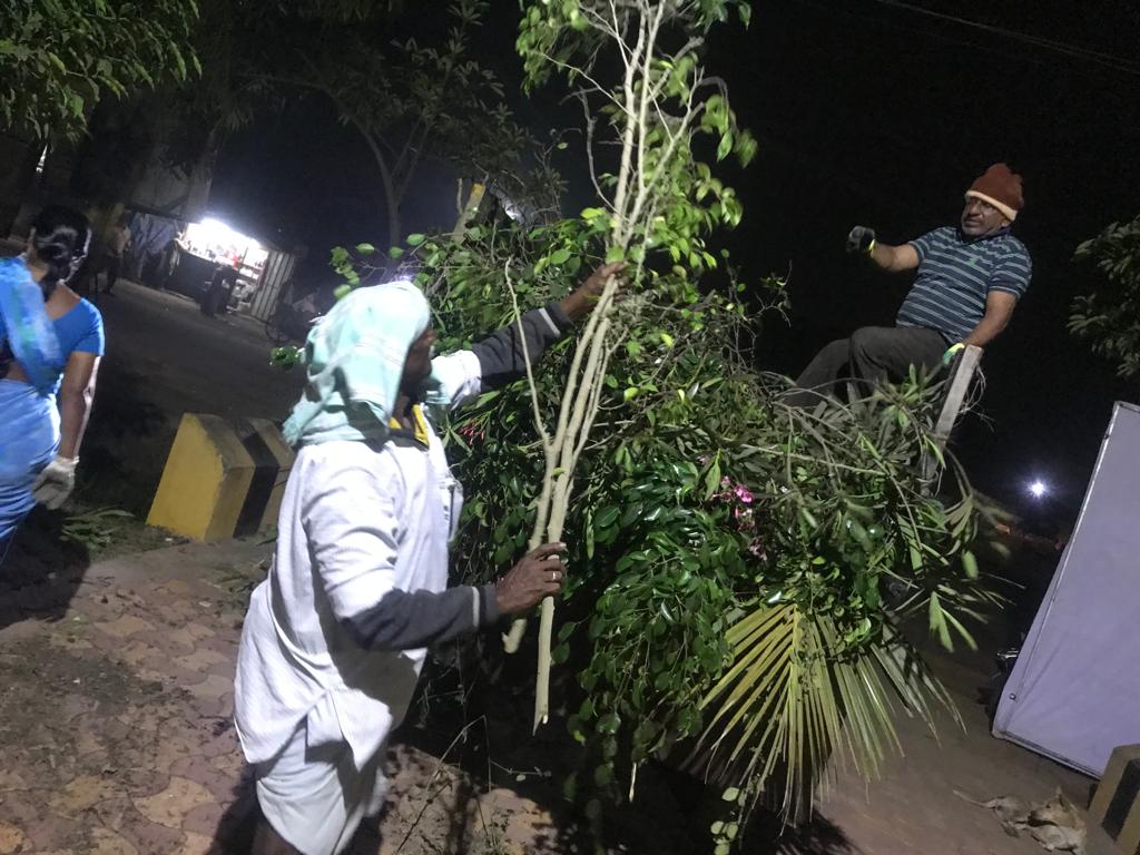 - ఒక పోస్టల్ ఉద్యోగి ఎత్తైన అంబేత్కర్ సరసన నిలబడి, చెట్ల కొమ్మల్ని తొలగిస్తుండడం,