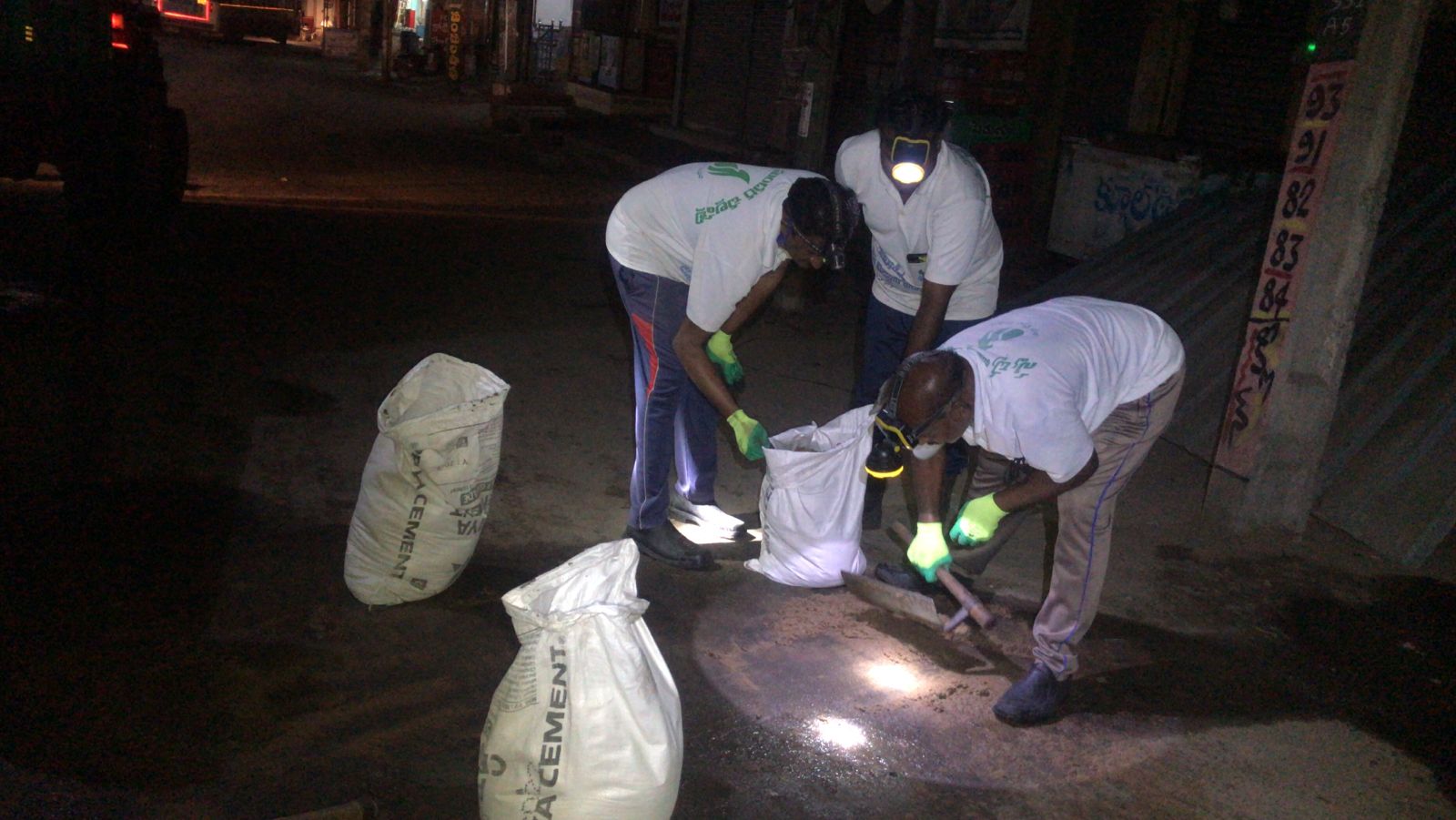 - నలుగురేమో విద్యుత్ భవనం దగ్గర గత నెల దాక పడిన వానలకు పెద్ద దశ చక్ర వాహనాలతో రోడ్డు మార్జిన్లో పడిన పెద్ద గుంటల్ని పూడ్చారు.