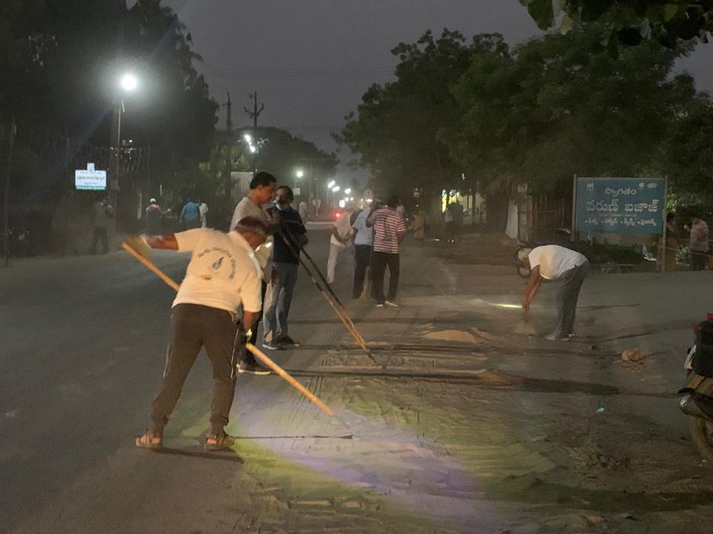1)ఇసుక-దుమ్ము-ధూళి దురాక్రమణలతో సగం దారి మూసుకుపోగా పాతిక మంది పారలు / రైల్వే పారలు/గోకుడు పారలు / చీపుళ్లు – డిప్పలు వాడుతూ రహదారి వైశాల్యాన్ని రెట్టింపు చేసిన వైనం,