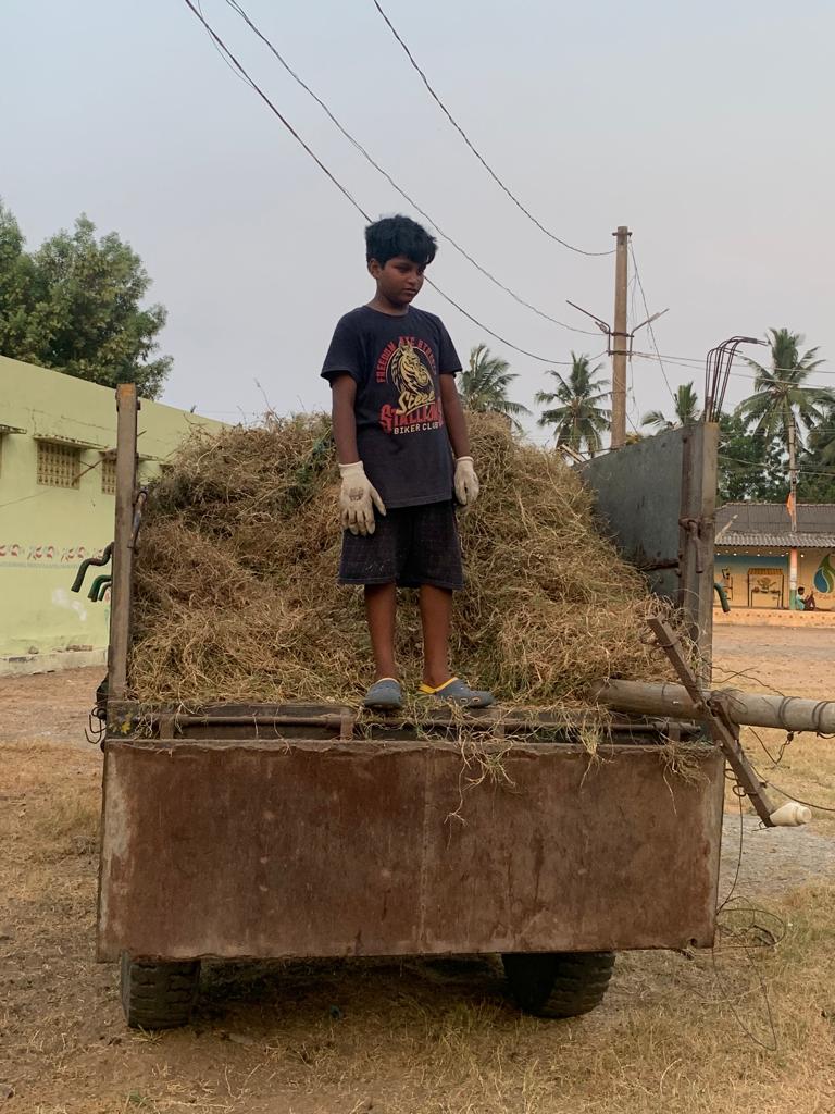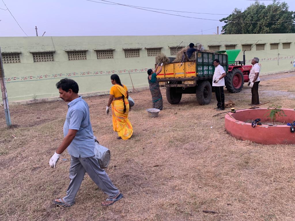 కోసిన గడ్డిని మహిళా కార్యకర్తలు ఎప్పటిది అప్పుడే శేషం లేకుండా గంపలలోకి ఎత్తి ట్రాక్టర్ లో లోడు చేసినారు.
