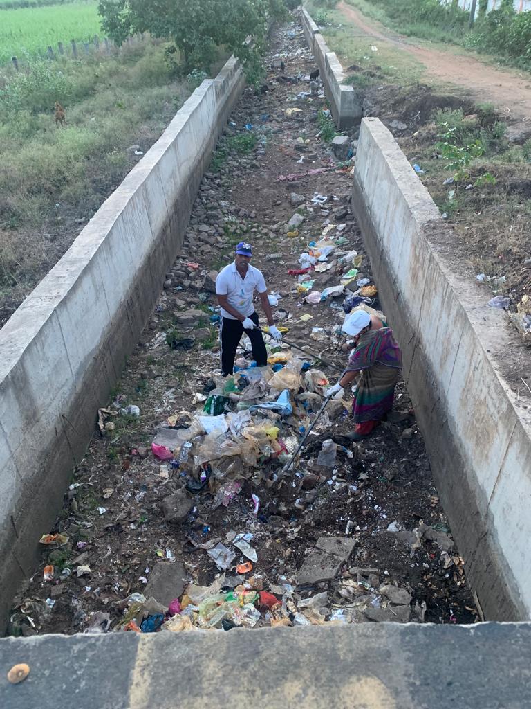 పంట కాలువ గట్టు మీద ఒకామె ఎన్నెన్ని కశ్మలాలు ప్రోగేసిందో గమనించండి! వంతెనకు పడమరగా కాల్వలో దిగిన ఇద్దరు కార్యకర్తలకైతే మరీ చేతుల్నిండా పనే! గోనె సంచిడు ప్లాస్టిక్ వ్యర్థాలు! ఐతే – ఏ మాటకామాటే చెప్పుకోవాలి! ఏడెనిమిదేళ్ల నాడు ఈ వంతెన ప్రాంతం ఎంతగా కంపుకొట్టే చెత్త కేంద్రంగా ఉండెనో, దాన్ని బాగుచేస్తూ కార్యకర్తలెంతగా వాంతులు చేసుకొన్నారో గుర్తుకు తెచ్చుకొంటే – ఈ రోజు వీళ్ళ శ్రమ మరీ కష్టసాధ్యమని పించదు!