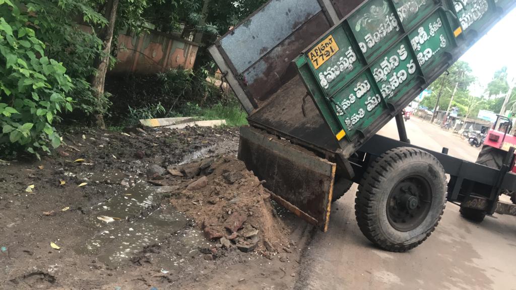 నడకుదురు రోడ్డు దగ్గర – సుజల కేంద్రం, ఎదుట – నిత్యమూ రద్దీగా ఉండే వినిమయదారుల సౌకర్యార్థం-అక్కడి గుంటను ఎక్కడి నుండో సేకరించి పెట్టుకున్న మట్టి- రాతి ముక్కల్తో నింపి, సర్దడం వాట్సాప్ వీడియో లో గమనించండి !