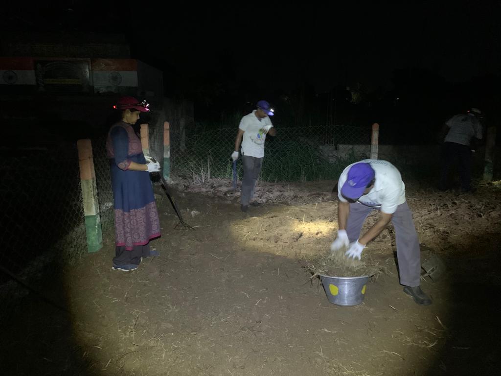 అదేమో ఈ బుధవారం వేకువ 4.19 - 6.07 సమయాల మధ్య ప్రవర్తిల్లినది! సదరు గ్రామ సేవా నిరతులు 27 మంది! ఈ విలక్షణ కార్యక్షేత్రం మళ్లీ బెజవాడ రహదారిలోని జాతిపిత స్మృతి వనమే! అదీ అతని పాదపీఠి ఎదురుగా కుడి ఎడమలుగా పరిమిత ప్రదేశమే! పని చోటు పరిమితమే గాని, అక్కడి కార్యకర్తల శ్రమ, పుట్టుకొచ్చిన వ్యర్ధాలు మాత్రం అపరిమితాలే!