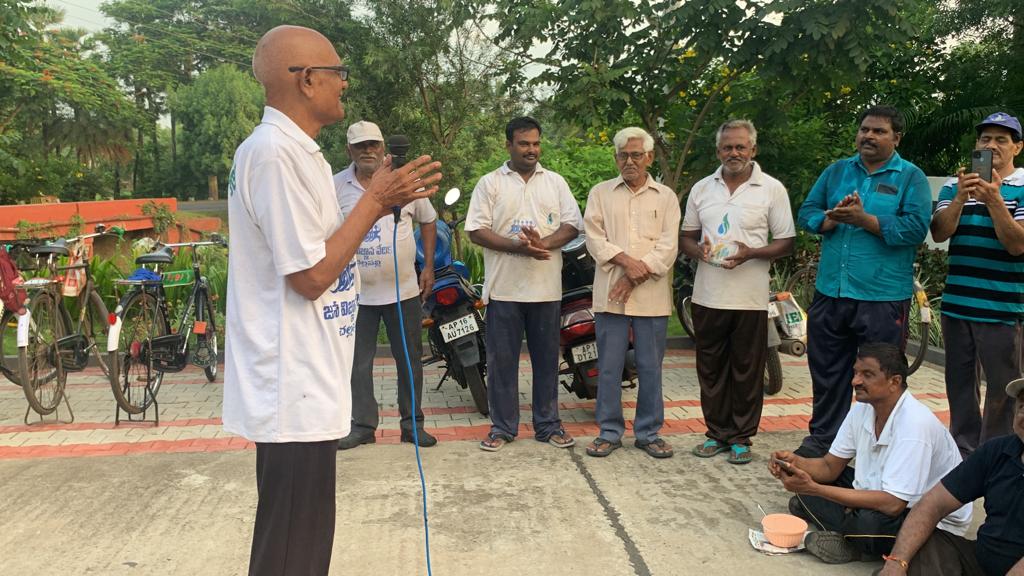 శ్రమ వేడుక ముగిసి, కాఫీ - కబుర్ల వేడుకలో 87 ఏళ్ల వయోవృద్ధ వైద్య/ దాతృత్వ/ కార్యకర్త - దుగ్గిరాల శివప్రసాద్ మహోదయుడు ముమ్మారు నినదించిన గ్రామ శుభ్ర - సౌందర్య నినాదాలు వినిపించాయి! సదరు సీనియర్ వైద్యుని 5 లక్షల వితరణను కార్యకర్తలు గుర్తుచేసుకొన్నారు!