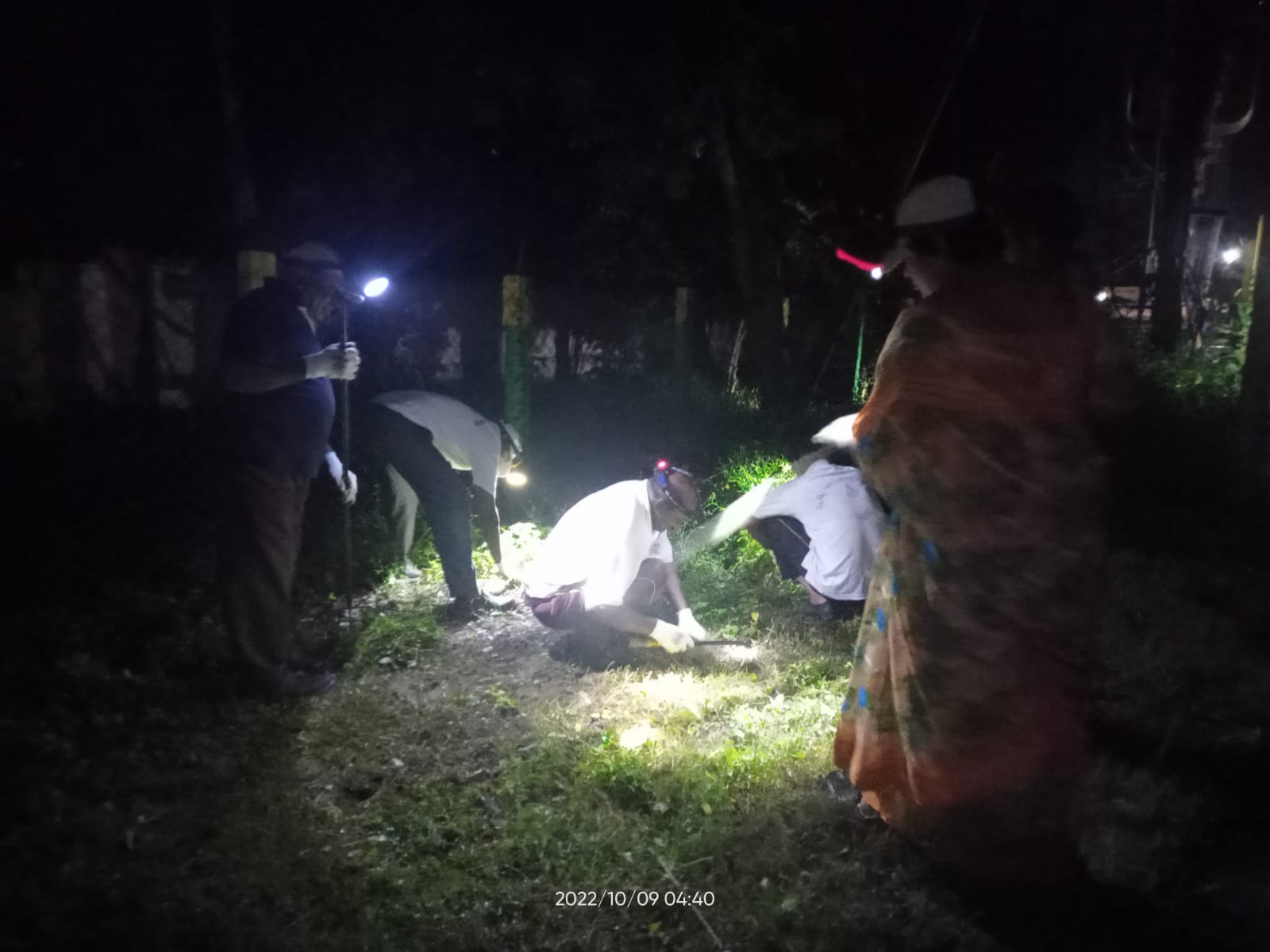 4.20 కే కార్యకర్తలు పని చోటుకు చేరుకొన్నారు గాని – అంతకు ముందు 3.00 కే పడిన వానతోనూ, ఆగని ఉరుములు మెరుపులతోను ‘అసలీ వేకువ శ్రమదానానికి పాల్పడాలా – వద్దా’ అనే సందిగ్ధం! ఐనా సరే – ‘ వరుణుడు విశ్వరూపం చూపించడులే’ అనే భరోసాతో మొదలైన కార్యక్రమం ఆసాంతం వాన నేస్తం తోడుగానే సాగింది.