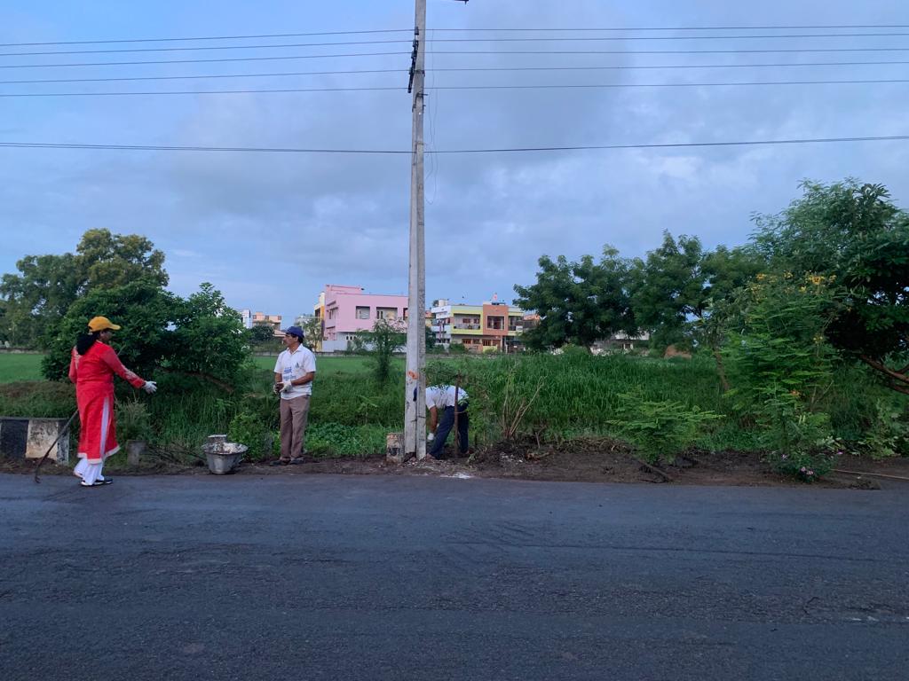 రహదారికి పడమర వైపున నిన్నా - మొన్నటి సుందరీకరణ – హరితీకరణ ప్రయత్నం నేటికి ఒక కొలిక్కి వచ్చినట్లుంది. వరినారు మడిని సిద్ధం చేసినంతగా ఆ జాగాను తీర్చి దిద్ది రెండు రకాల పూల మొక్కలు నాటారు!