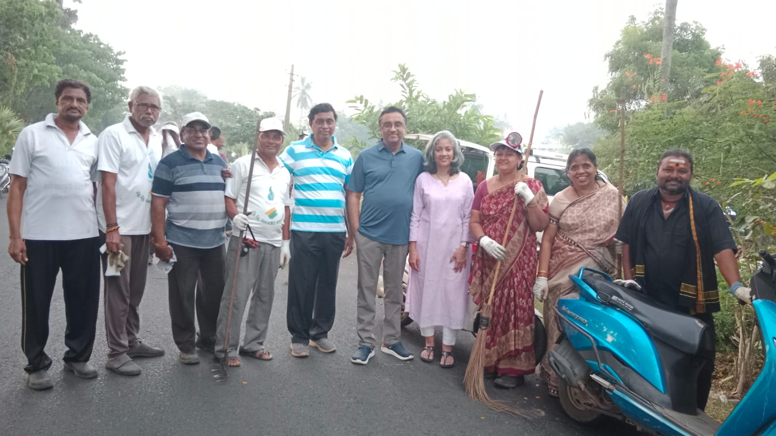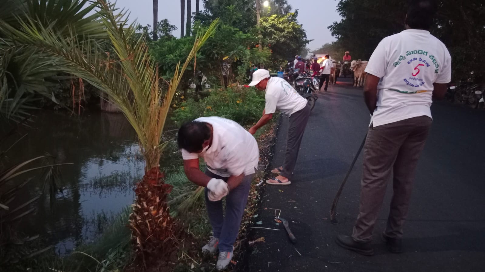 1) నేటి కార్యకర్తల - తదితరుల హాజరీ 65 (వీరిలో 45 మంది నికరంగా రహదారి పారిశుద్ధ్య కార్మికులైతే మిగిలినవారు అతిథి – అభ్యాగతులూ, కొంత ఆలస్యంగా వచ్చిన వారూ – (ఐతే వీరిలో ఒకాయన (ZPTC) ఒక కార్యకర్త చేతిలో కత్తి తీసుకొని ఈత చెట్టును సుందరీకరించడం చూడండి!)