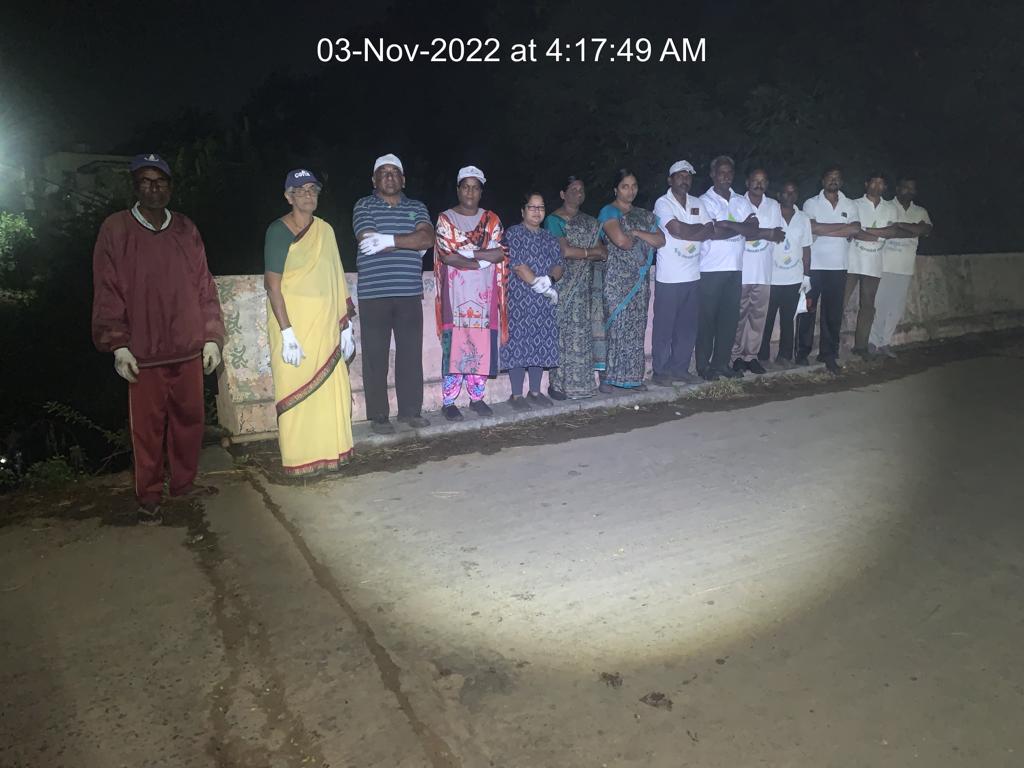 గురువారం (3-11-22) వేకువ 4.17 కు పాగోలు బాట మురుగు కాల్వ వంతెన దగ్గర కలుసుకొన్నది 15మంది! నిముషాల ఎడంలో వచ్చి పనిలో దిగింది ఇంకో 10 మంది. అప్పుడందరూ కలివిడిగా ప్రాకులాడినందున బాగా శుభ్రపడింది బ్రహ్మం గారి గుడి నుండి భవన విభాగాల (అపార్ట్మెంట్స్) పర్యంతం - సుమారు 100 గజాల పాగోలు రోడ్డు!