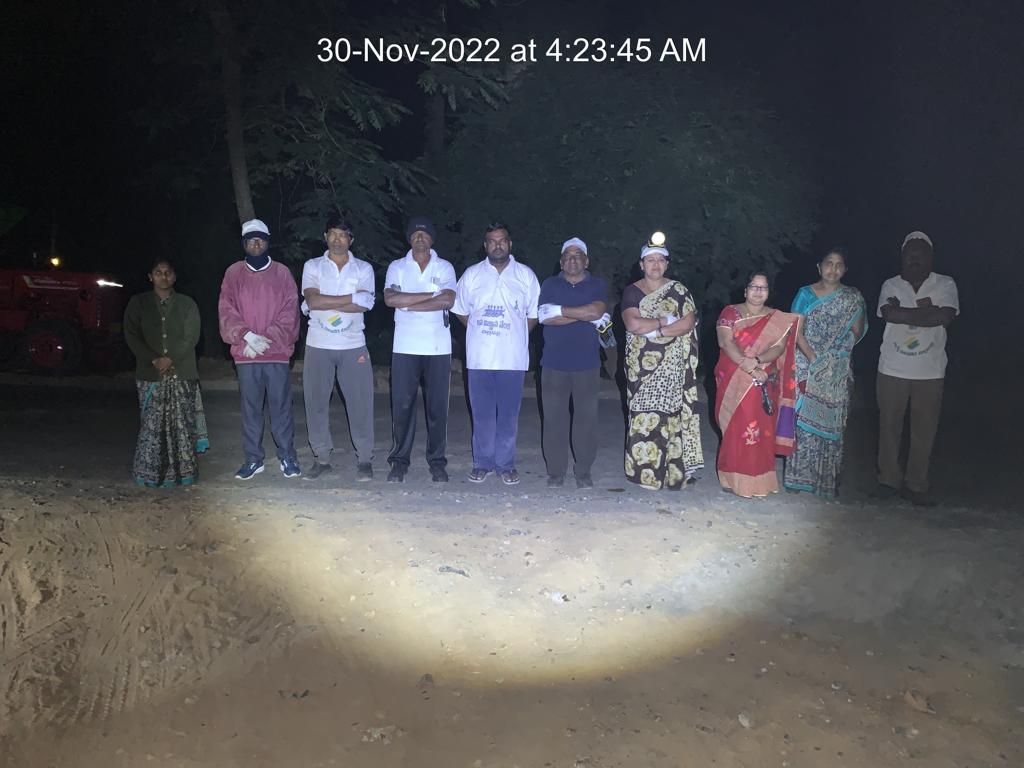 అసలది వేకువ కటిక చీకటి – వీధి లైట్లన్నా వెలగడంలేదు - పైగా మెడలో గంటలు మ్రోగని ఎడ్ల ఇసుక బళ్లు! ఆ 100 గజాల జాగాలో - రెండు డ్రైన్ల అంచుల దాక శ్రమదాతలు రెండు భాగాలుగా మారి,