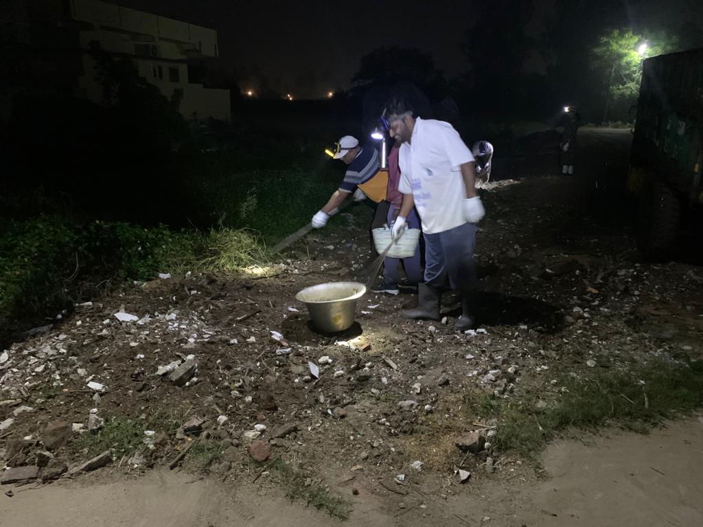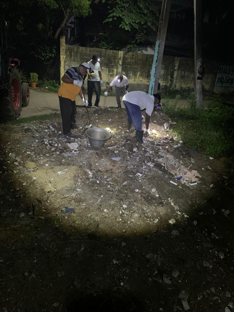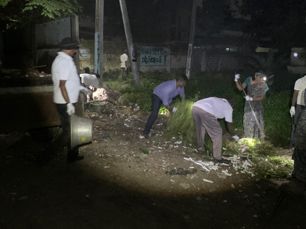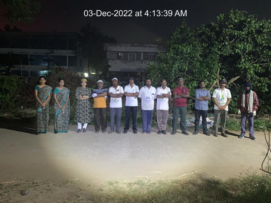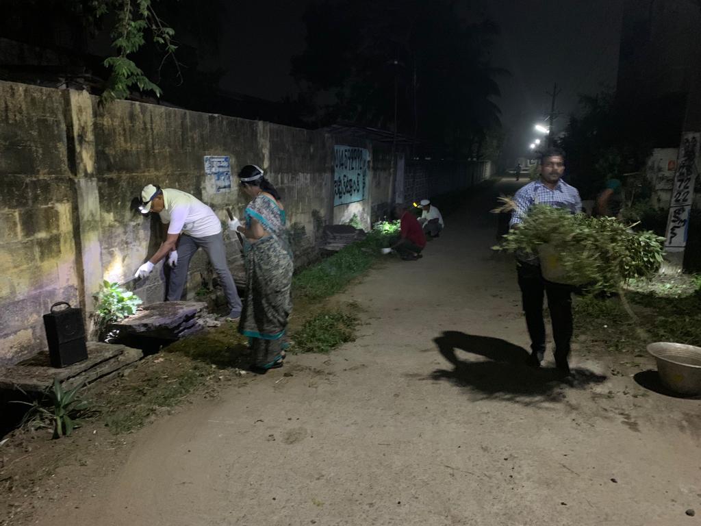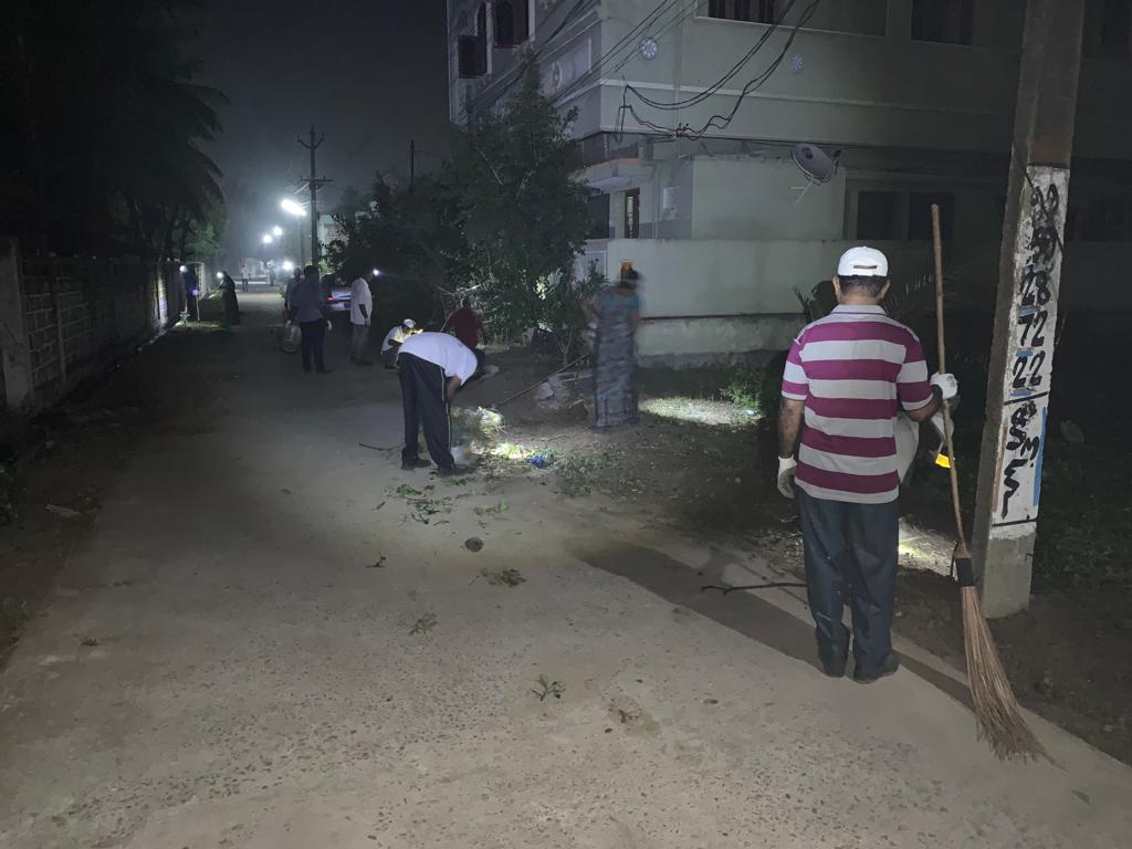 శనివారపు వేకువ, “4.30” అనే నిర్ణీత క్షణాల కన్న ముందే – 4.13 కే సంసిద్ధులైన 14 మంది పర్యావరణ హితుల్నీ, త్వరగా వచ్చి వారితో కలిసిపోయిన అంతే మంది ఊరి వీధి బాధ్యుల్ని తొలి నిముషాల ఛాయా చిత్రాల్లో గమనించండి! ఊరి కాలుష్యం మీద నేటి యుద్ధ రంగం ‘ప్రొద్దుతిరుగుడు’ బడి తూర్పు, దక్షిణ వీధులు!