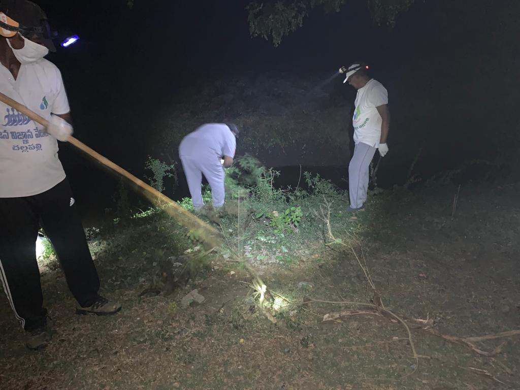 కొందరు కార్యకర్తలకు అంతకుముందు తాము శుభ్రపరచిన చోట కొన్ని లోపాలు కనపడడంతో వెనక్కు నడచి, చిన్న చెట్ల పాదుల్లో ఎరువు నింపి, ఒక పెద్ద తాడి బొందును కాల్వ అంచున అందంగా సర్ది, నీటి అంచున గడ్డీగాదం (అందులో కదలాడిన రక్తపింజరను చంపక వదిలేసి) తొలగించడంతో నేటి పని ముందుకు సాగలేదు!