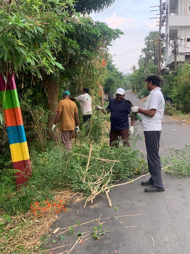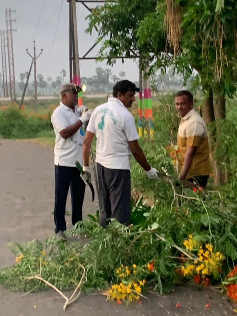 ఫొటోల్లో 10 - 12 మంది దాక కనిపిస్తున్నా నేటి నికర శ్రామికులు 7 గురే! కత్తులతో – కత్తెర్లతో – దంతెలతో - 100 నిముషాలకు మించి పాటుబడింది గంగులవారిపాలెం వీధి తొలి మలుపు డ్రైను దగ్గరే! వాళ్ల ధాటికి తొలగిన కశ్మలాలూ, సుందరీకృత వృక్షాలూ సుమారు ఇరవయ్యే!