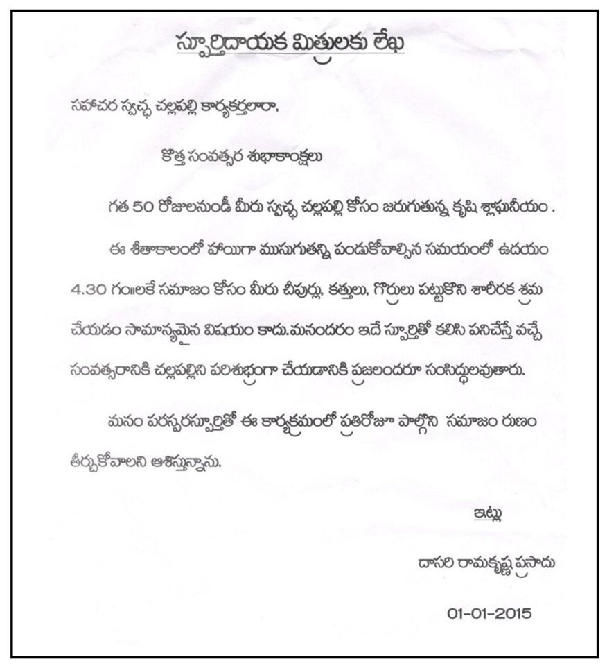 Read Moreఆరు 'జనవరి 1st' లు చూసిన స్వచ్చ సుందర చల్లపల్లి 2015 జనవరి 1 న (51 వ రోజు) సహ కార్యకర్తలకు రాసిన లేఖ...