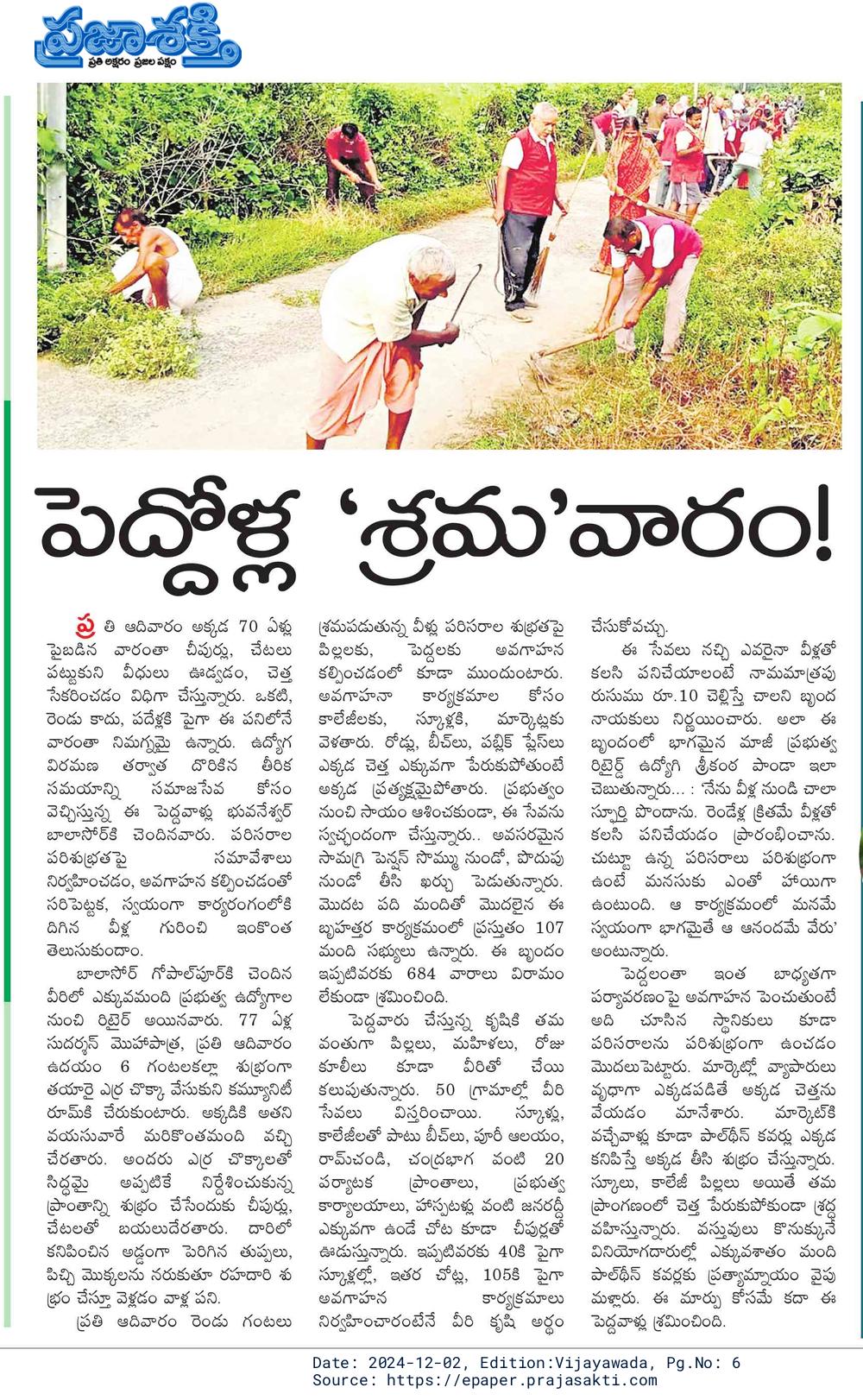 Read Moreతమిళ శ్రీనివాసన్ విస్తుపోయిన 2 నిజాలు! చెత్తను సంపదగా మార్చడంలో ‘జగమెరిగిన శ్రీనివాసన్ కు’ పరిచయమెందుకు గాని, ఈ 24-10-2024 శ్రమదాన సమయంలోని పై ఫోటోనూ అందరూ గుర్తించగలరు గాని, పనిలో బ్రహ్మ రాక్షసుడైన ఆ అరవ పెద్దమనిషి కళ్లు నిబిడాశ్చర్యంతో విప్పార్చిన ఉదంతమొకటి గుర్తుచేసుకొందాం! &n...