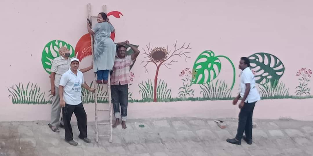 100 మీ గోడపై పుష్ప చిత్రాలు, నినాదాలు వ్రాసారు. దారిన వెళ్ళేవారందరికీ అకర్షిస్తున్నాయి.